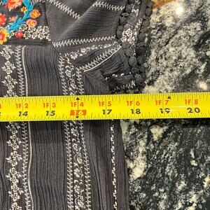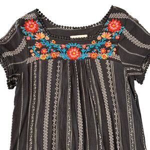 SIZE SMALL - This Savanna Jane Gray Embroidered Floral Boho Short Sleeve Top is precious! Perfect for the summer and festival season. It is Boho flowy Colorful embroidered detail around neck and sleeves, Lightweight. Fabric: 100% rayon. APPROXIMATE MEASUREMENTS- Chest across is about 17". Length is about front 22" back 24"