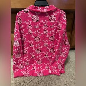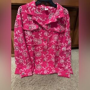 Elevate your wardrobe with this uniquely feminine denim jacket! Featuring intricate floral embroidery and cutout details on a hot pink jacket, it's perfect for layering over any outfit. With a relaxed fit and button-front closure, this jacket adds a touch of quirky charm to your everyday look.