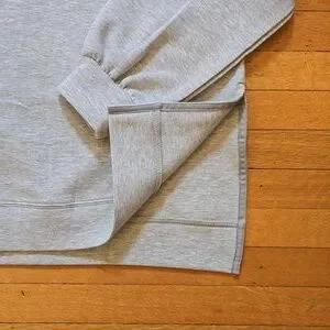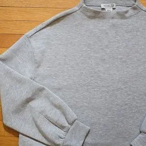 This stylish Rachel Zoe sweatshirt in light gray offers a modern and comfortable fit. It features a chic mock neck, trendy drop shoulders, and subtle side slits for a flattering drape. In excellent used condition, this versatile piece is perfect for an elevated casual look.