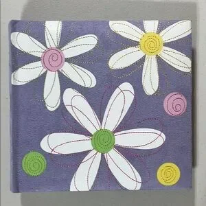 Purple album with colorful floral patterns. Features white, pink, yellow, and green accents.