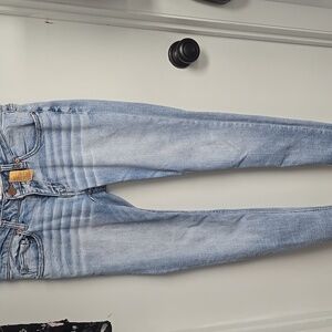 These blue skinny jeans feature a light wash with subtle fading patterns, offering a stylish and lived-in look. The soft denim provides a comfortable fit that tapers down the leg, perfect for a casual outing. 28x29.5