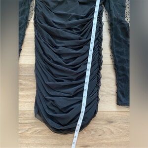 This elegant black dress features long sleeves and a flattering ruched design. Perfect for any occasion, it offers a sophisticated and timeless look. It’s flexible because it’s elastic. Zipper on the back. In EXCELLENT CONDITION.