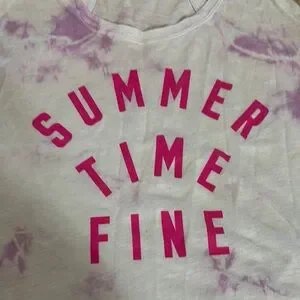 Stylish tank with bold pink lettering. Features a purple tie-dye pattern. Ideal for casual outings.