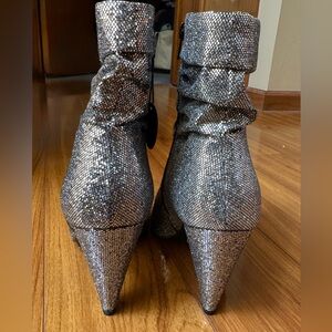Step into glamour with these New Look heeled boots, featuring a dazzling silver glitter finish. The slouchy shaft and pointed toe design add a chic touch, while the moderate heel height ensures comfort and style. Perfect for making a statement at special occasions.