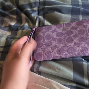 Elegant Coach clutch in a vibrant purple. Features signature pattern and wristlet strap.