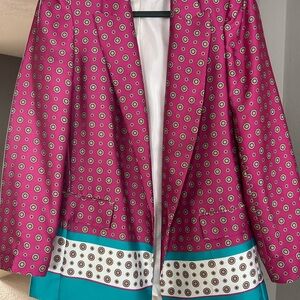 Vibrant pink blazer with circular patterns. Features teal and white accents. Stylish and bold design by Zara.