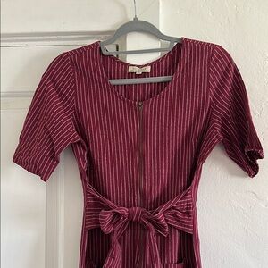 Comfortable cute striped jumpsuit with zipper front and tie waist. Great for longer legs as well! Lightweight, two front pockets