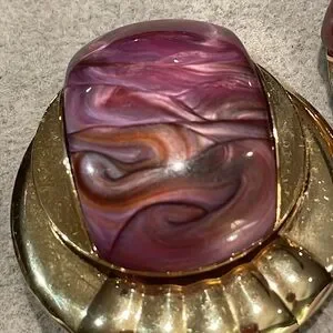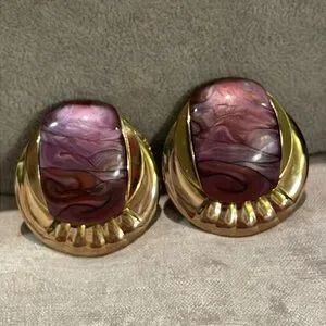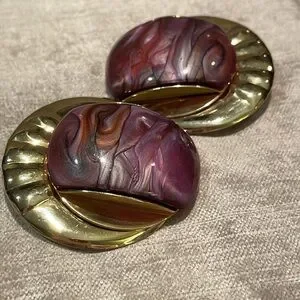 These stunning Vintage earrings showcase a deep purple central stone with a marbled texture, elegantly set in a warm gold metal. The oval design and ribbed setting add a touch of timeless sophistication, making them a perfect accessory for any occasion.