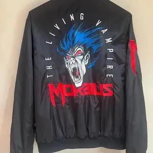 Marvel Morbius bomber jacket in black with striking red accents. Features bold logo on chest and sleeve.