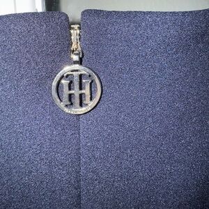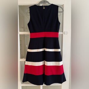 This sophisticated sleeveless mini dress by Tommy Hilfiger features a striking black and red color palette, perfect for a wedding guest or cocktail event. The crew neck and classic A-line silhouette offer a timeless elegance, while the structured fabric ensures a flattering fit. Like new condition.