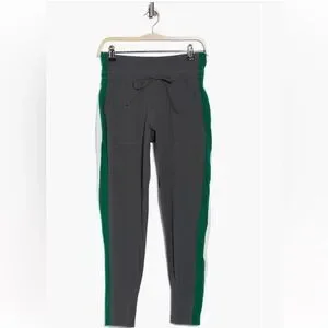 Stylish gray joggers featuring a bold green stripe. Perfect for casual wear.