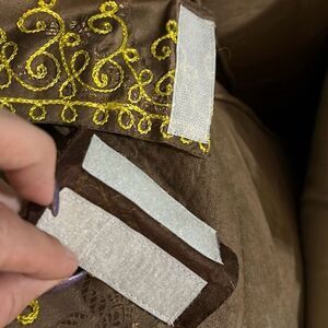 Ethnic, earthy-tone, brown/green, embroidered, special occasion dress. Sleeves are embroidered & The rest of the dress is fully lined. Comes in three pieces & is listed as One Size by Kirat.