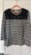 Elegant blouse with black and white stripes. Features intricate lace on the neckline. Ideal for versatile styling. 3/4 sleeves on top. New with tags.