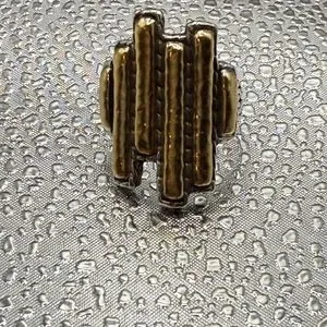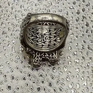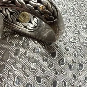 Stylish gold and silver textured ring. Unique design with a bold look. Purchased at Neiman Marcus about 20 years ago. There was a trunk show and John Hardy personally signed the inside of the ring.