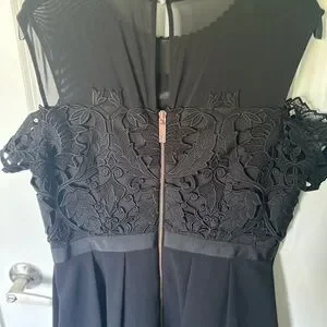 Formal black lace detailing Ted Baker dress, cold shoulder, size 4 UK fits around a size 8 to 10. Structured, mid length. Arm straps/cuff can be removed to make dress sleeveless. Worn once.