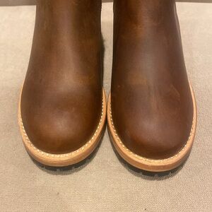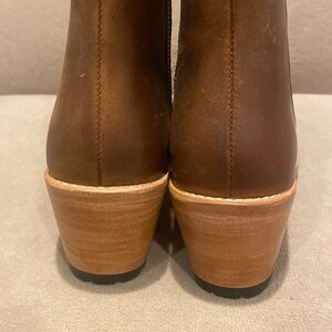 These booties are made with a leather upper, lining, and footbed, with a durable metal side zipper. They have a mid-block heel for comfortable height, a round toe, and a sturdy leather upper material. They feature a vegetable-tanned sole and a lugged sole with TPU tread. New without box