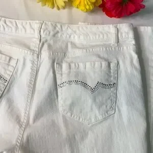 Stylish white jeans featuring rhinestone detail on the pocket. Perfect for a chic look. These are great pair jeans and wore only a couple times . I bought them from the store myself and well actually all my inventory is my own store or buisnesses.