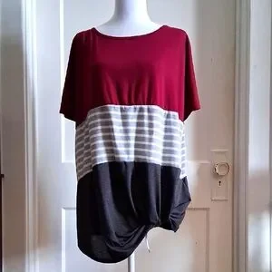 Discover the relaxed elegance of this Maurices tunic, featuring a striking red and white color palette with an asymmetrical design. The soft, stretchy fabric ensures comfort, while the tunic's relaxed fit and unique style make it a versatile addition to any wardrobe.