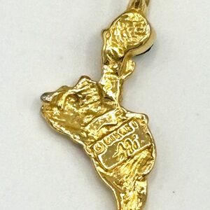 Charming gold bear pendant featuring a vibrant red accent and a sparkling green gem. Perfect for adding a playful touch to any outfit.