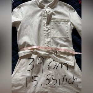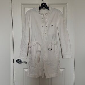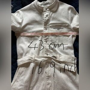 This is a Stella McCartney jumpsuit, featuring a stylish white design with a button-down front, long sleeves that can be rolled up, and a chic belt with a metallic buckle accentuating the waist. The outfit has a relaxed yet sophisticated look, with a knee-length cut and a comfortable, breathable fabric.
