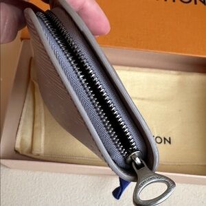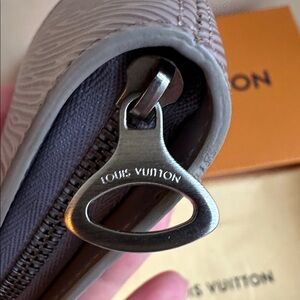 Vintage Louis Vuitton Lilac Epi Demi Lune Zip Wallet with box and dustbag VI0031. Rare color. Can also be used as a cosmetic case for smaller items. 6.75”x4.5”x1” Middle zip compartment, 2 large compartments, full slip pocket, 4 card slots. Color may appear purple or gray depending on the lighting but it is lilac. This wallet is in excellent condition. Very minor indents inside top where zipper pull meets leather and two small marks shown in last photo but have to be up close to see.