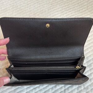 Crafted from premium leather, the Michael Kors brown wallet offers a sophisticated touch to your accessory collection. Its sleek design and high-quality materials ensure durability and style, making it a perfect choice for any occasion.