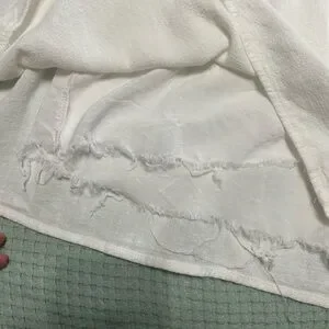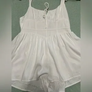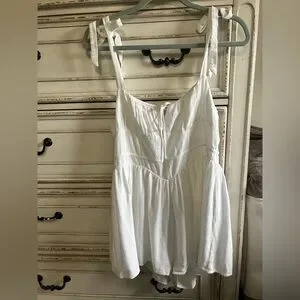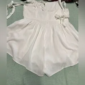 Chic white romper with tie straps. Perfect for summer outings. Linen like material, lining has been trimmed so it does not hang longer than the romper itself.