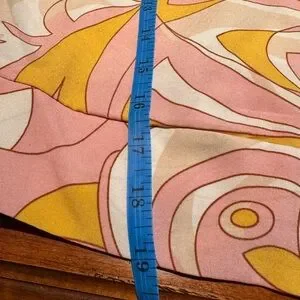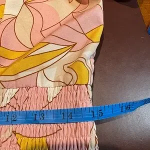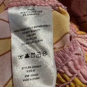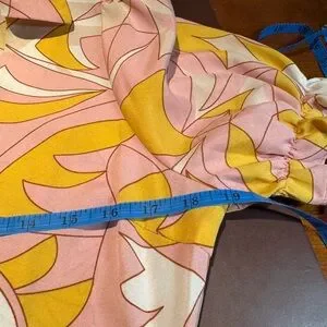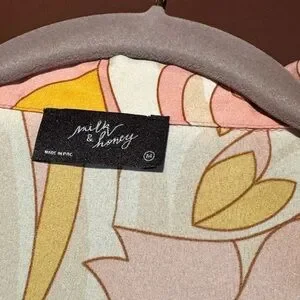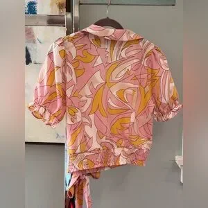 Milk and Honey Blouse. Silky lightweight fabric in pink orange white design. V neck with waist banded tie front and back Elastic Shirred waist banding.