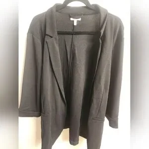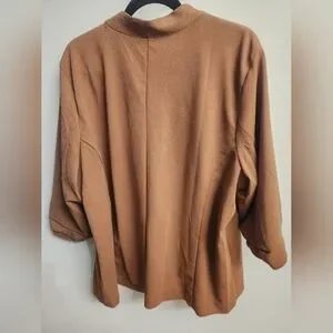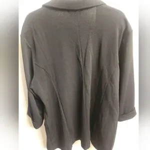 Stylish open-front blazers. Features rolled sleeves and zip pockets on brown, pockets on black. About 33" from top of shoulder to bottom.