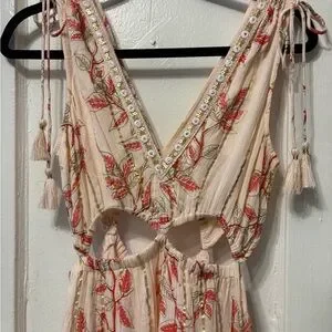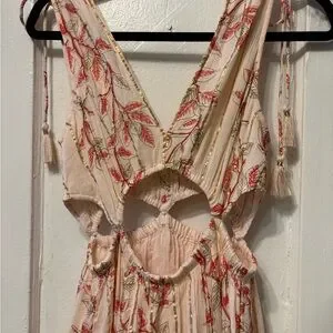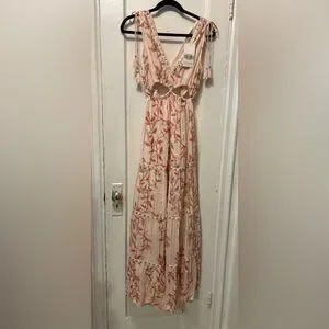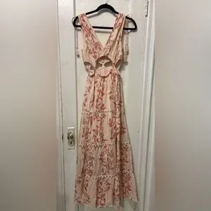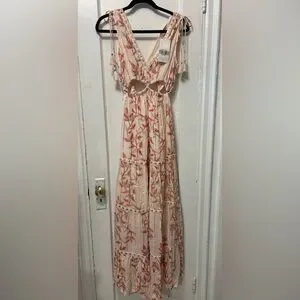 This chic maxi dress features a beautiful floral design with elegant cut-out details. Perfect for any occasion.