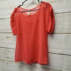 Anthropologie Sparrow red and tan semi sheer polka dot top. 100% polyester. Size: S