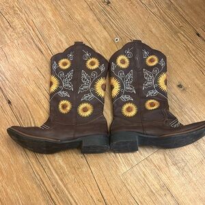 Stylish brown cowboy boots featuring sunflower embroidery. Perfect for adding a touch of flair to any outfit.