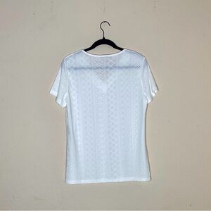 Elevate your style with this elegant white eyelet V-neck top. Perfect for any occasion, this top offers a chic and comfortable fit.