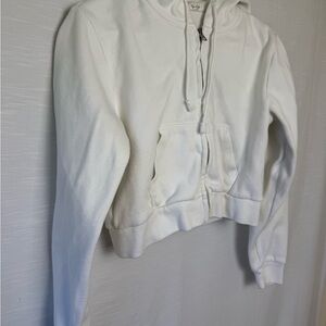 Cozy cream hoodie with zip closure. Features drawstring hood.