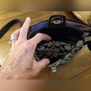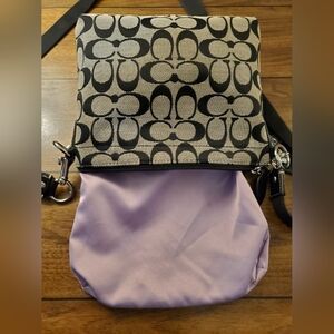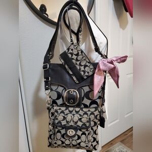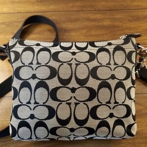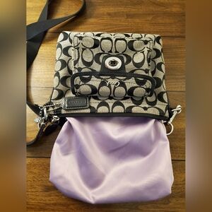 This grey and black signature C canvas COACH swingpack is in GOOD preloved CONDITION! Clean inside and out! 1 outside turnlock pocket. Hang Tag, and pink satin lining inside. Adjustable crossbody strap in excellent condition! Bundle and SAVE! GET THE SET, LARGE BLEEKER BAG, SWINGPACK AND MATCHING WRISTLET! AS SEEN IN LAST PHOTO! MAKE AN OFFER! Includes complimentary bag charm. Approximate measurements: 8" wide, 7" height, 3" wide filled with pocket. and 23" adjustable crossbody strap drop.