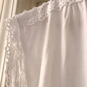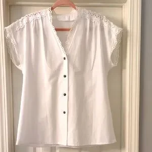 This elegant white blouse features delicate lace trim for a touch of sophistication. So pretty and elegant! 65% Polyester, 35% cotton.