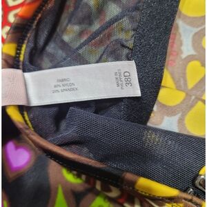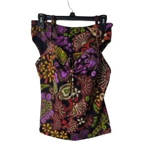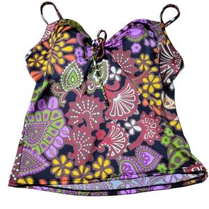 Embrace a bold and stylish look with this Victoria's Secret tankini top and bottom from 2008. The suit is featuring a striking purple and gold color palette. The bustier style offers a flattering fit, while the tie front adds a playful touch. Perfect for making a statement, this top combines elegance with a hint of retro charm.