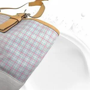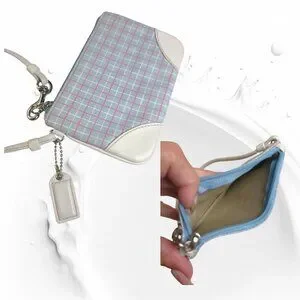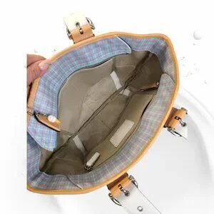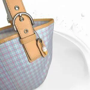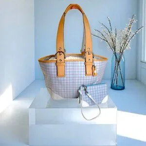 Vintage COACH Soho pastel blue plaid tote with vachetta leather & wristlet