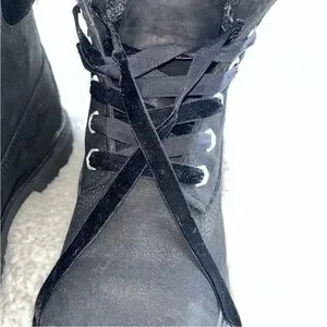 Women’s Black Velvet Timberland Boots with Velvet Laces. Womens size 6. Worn 1-2 times, a little dusty but no signs of wear, soles intact, no tears or stains. Smoke and pet free home.