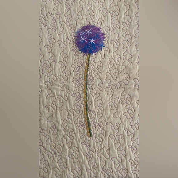 This is a handmade table runner with a quilted design and a wildflower chive flower pattern. It features beige, purple, and green colors and measures 41.5" x 21". The table runner is made of 100% cotton and is machine washable. It is suitable for multipurpose occasions and is could be hung and displayed as well.