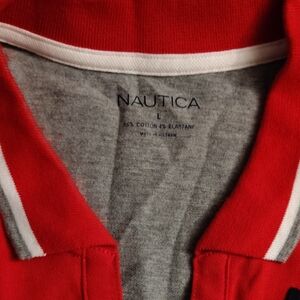 Nautica polo shirt with red and gray design. Features white diagonal stripe and logo detail.