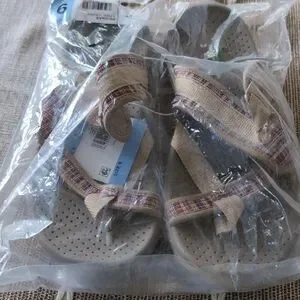 Comfortable Skechers sandals in taupe with multi-color accents. Perfect for casual wear.