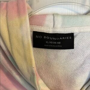 Soft pastel tie-dye hoodie by No Boundaries. Features a cozy design with a blend of pink, yellow, and green hues.