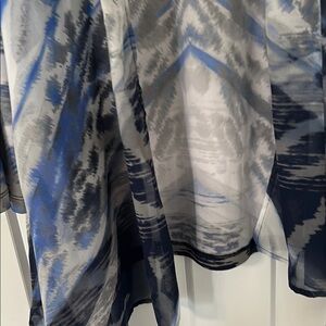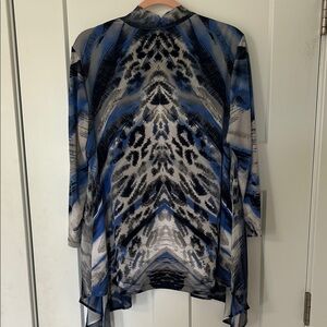Stylish sheer blouse with striking blue and black design. Open-front style. Perfect for layering.