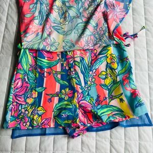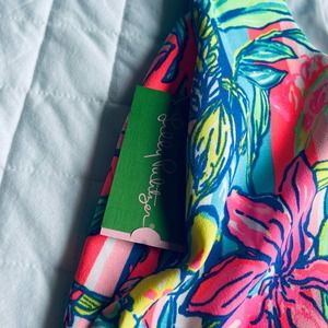 Reposh, worn once or twice. Tags have been reduced. The last picture is a current one. Bright and colorful dress by Lilly Pulitzer. Features a lively floral pattern. Perfect for a sunny day. Built in skirt.