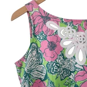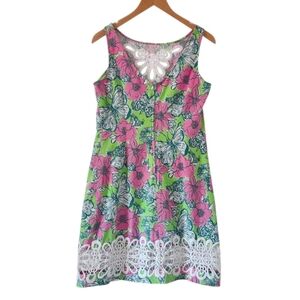 Lilly Pulitzer Retro Butterfly Shift Dress Pink + Green Lace Trim Sleeveless 8