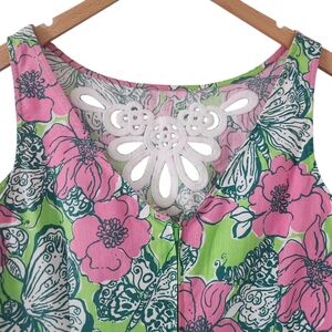 Lilly Pulitzer Retro Butterfly Shift Dress Pink + Green Lace Trim Sleeveless 6. Classic Lilly design and color from 2011 style 26846. Minor fading but great used condition. Crisp. Clean. V back is bra friendly. Back zip with hook and eye closure. Lace is thick and fantastic. Measurements taken laying flat and are approximate: