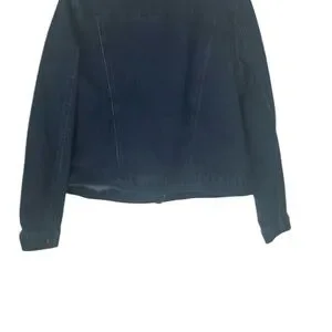 This NEW stylish blue jean jacket offered by Laura of Canada features a cropped, boxy design with sequin accents and a hidden snap front that adds a unique touch to your outfit. The long sleeves and subtle trim details make it a versatile piece for any occasion.