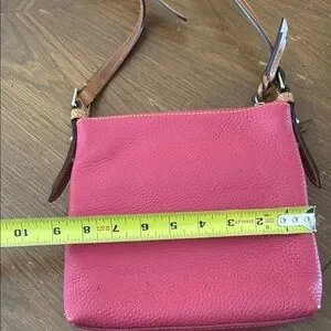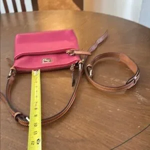 Great condition, a couple small pen marks as pictured, could possibly be cleaned. I did not attempt because I was nervous about ruining the finish. The Dooney & Bourke crossbody bag combines a vibrant pink hue with a contrasting brown strap, offering a stylish and practical accessory for everyday use. Crafted with attention to detail, this bag is perfect for those who appreciate both fashion and functionality. Its compact size ensures you can carry your essentials with ease, making it an ideal choice for daily adventures.