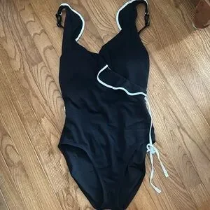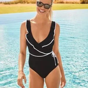 A chic wrap front design brings flair to this classic one-piece swimsuit, accented with white trim and elegant ruffles along the neckline.